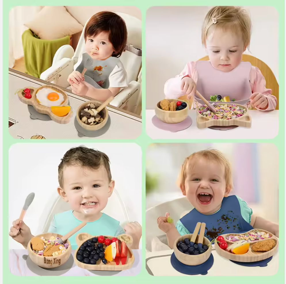 Crafted from eco-friendly bamboo wood and paired with a food-grade silicone suction base, this set keeps plates in place while encouraging little ones to enjoy self-feeding.
